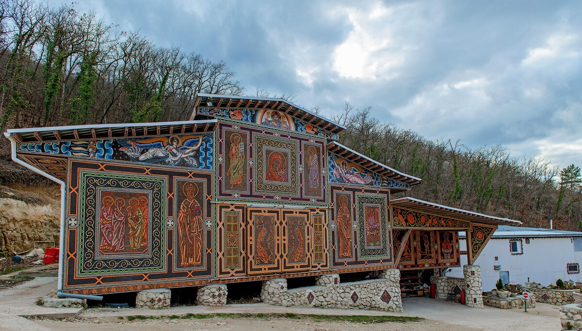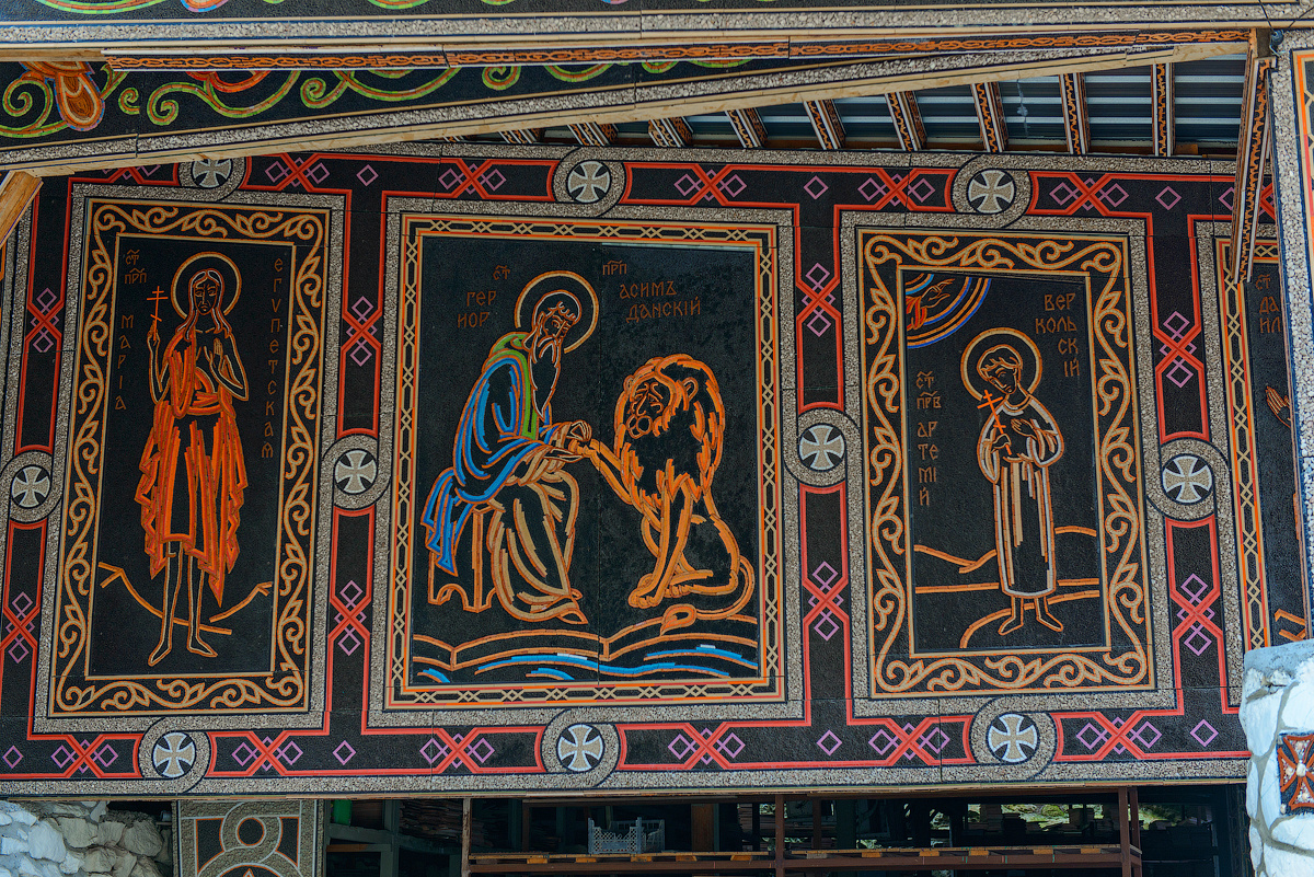Это скит Анастасии Узорешительницы. Все постройки в этом монастырском поселении выполнены с особым вниманием к деталям: мозаикой выложены образы святых, а некоторые оконные витражи украшены бисерным орнаментом.